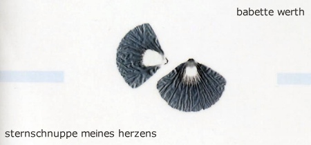 die mit uns in Kontakt treten und zu uns sprechen sie sind sehr weise reisende durch alle zeiten kleinodien, die uns begleiten stardust is a being most fine that will find us and speak it is very wise a travveller through the ages a jewel to be with us estrellas fugaces seres sensibles que nos busquan y nos hablan son muy sabios viajerosa tráves de los tiempos tesoros que nos acompánjan Text: babette werth erschienen in: babette werth sternschnuppe meines herzens stardust of my heart Berlin 2001 ISBN 3-8311-2786-7 zu beziehen auch über: Books on Demand GmbH http://www.bod.de/produkte/index.html |